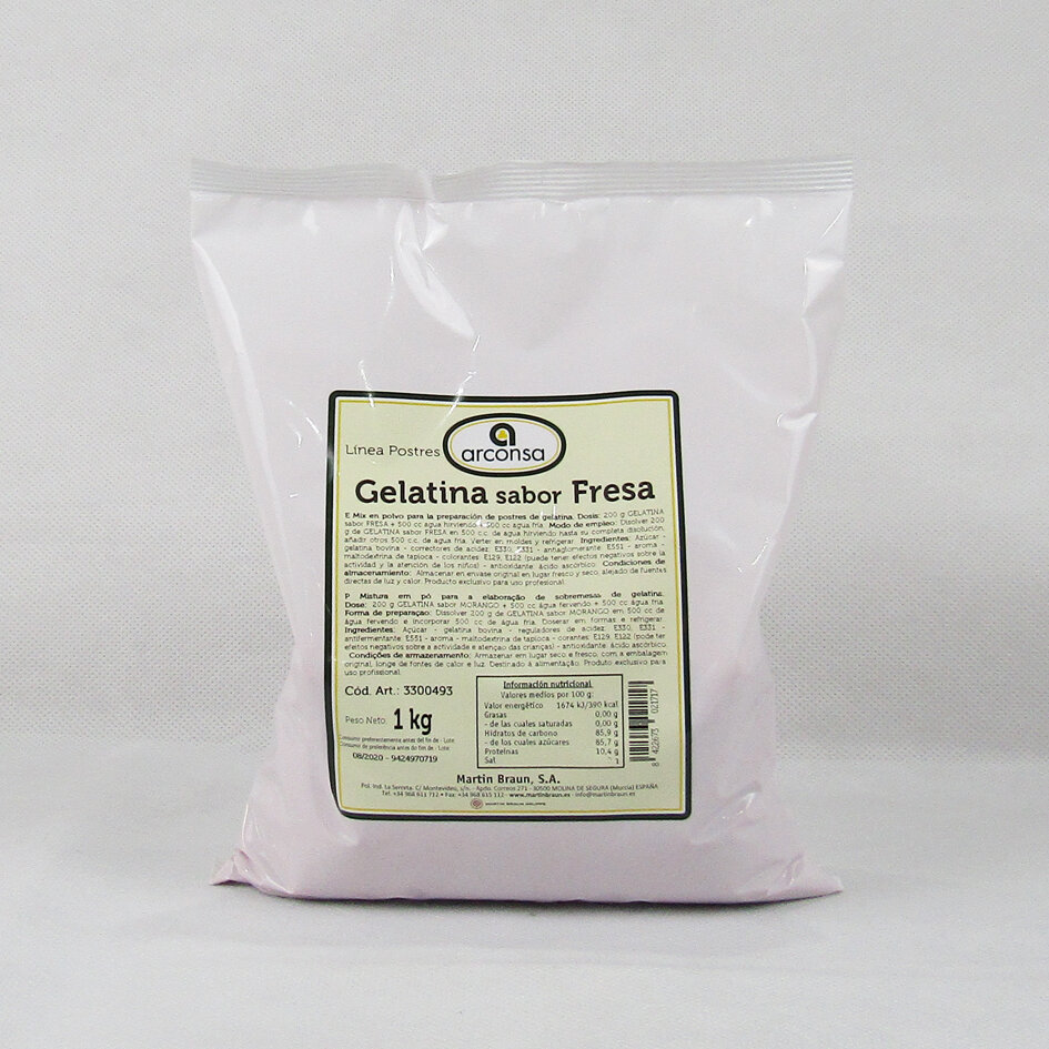 Mix en polvo para la preparación de postres de gelatina sabor fresa. Estabilidad y textura gelificada.