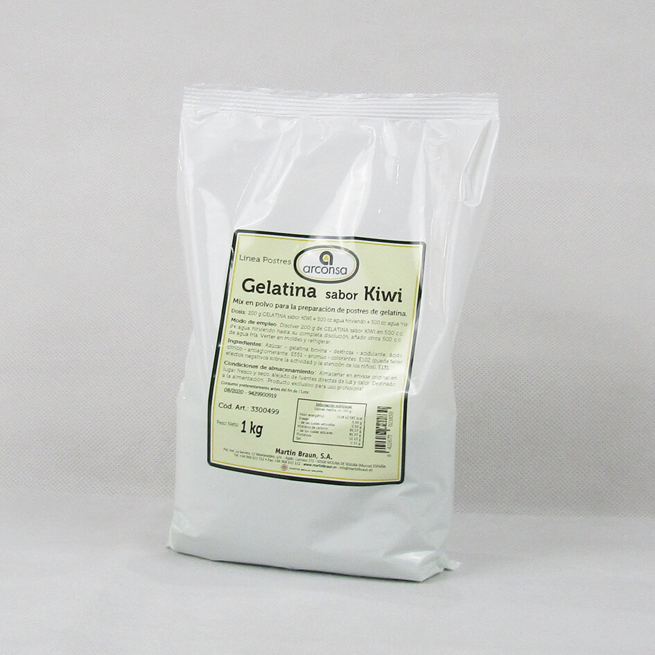 Mix en polvo para la preparación de postres de gelatina sabor kiwi. Estabilidad y textura gelificada.