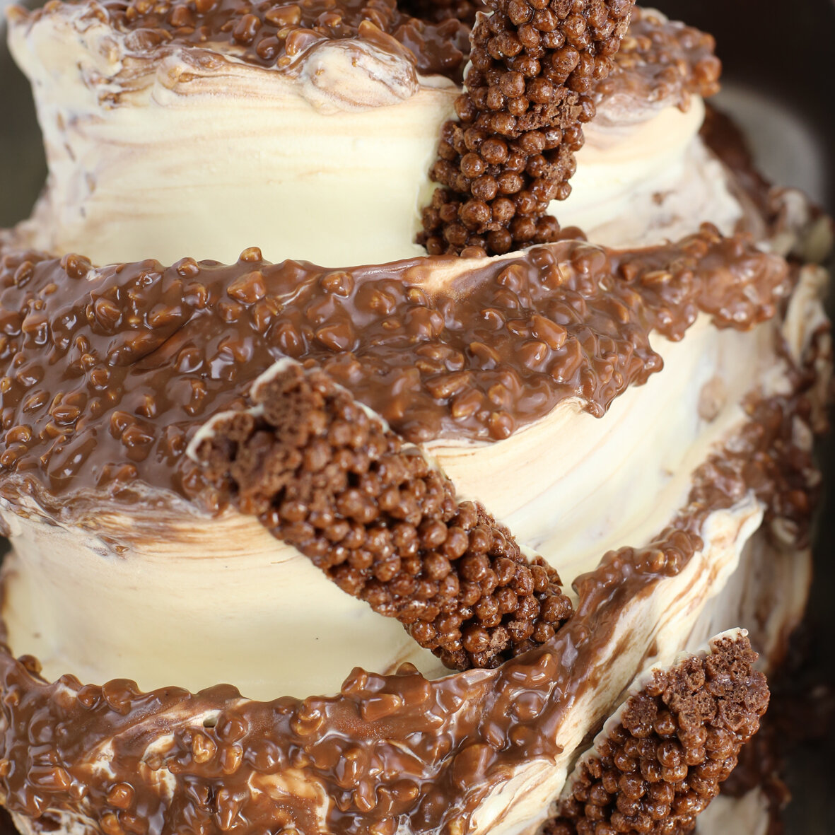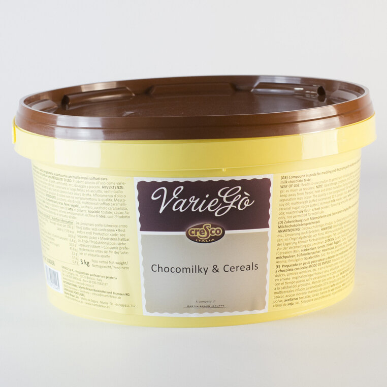 Veteado con chocolate con leche y cereales. Con 5 tipos de cereales inflados caramelizados.