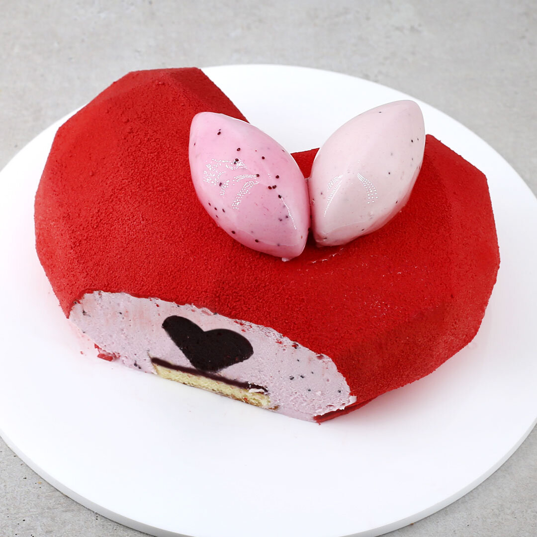 Añadir Confruttíssimi Dragon Fruit. Agregar todo suavemente a la crema. Vestir la masa obtenida en el molde en forma de corazón, disponer en su interior un poco de gelée en forma de corazón, terminar con otro masa y cerrar con el mat + gelée.