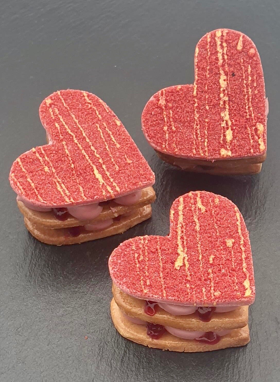 Terminar con otra galleta ligeramente pintada o bañada con Schokobella Ruby, azúcar cristal rojo y Decor Gold.