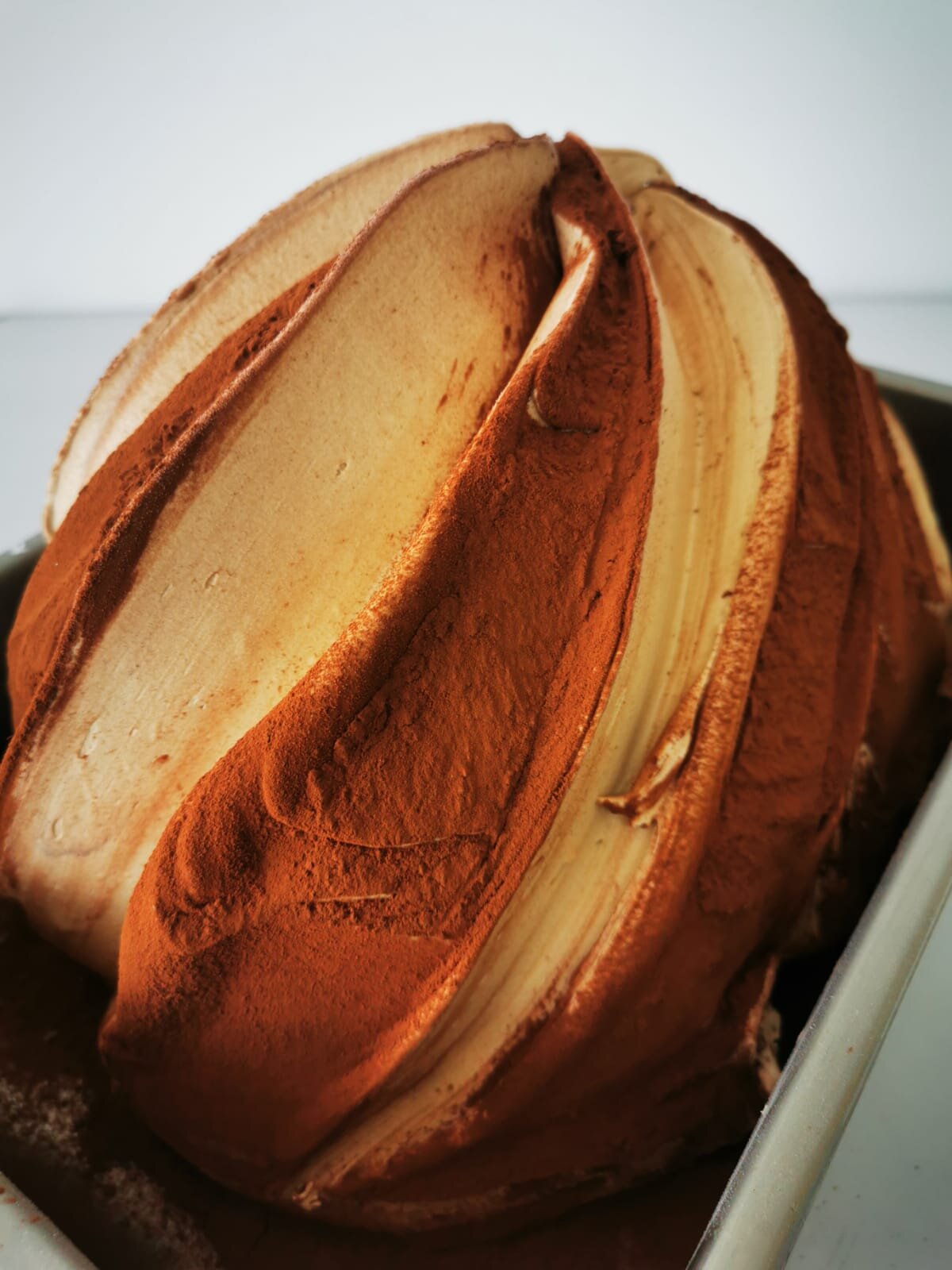 Calentar a unos 70-80ºC la leche y añadir el resto de ingredientes previamente mezclados poco a poco con agitación media alta de la túrmix. Por último, añadir la nata y dejar reposar unos 30 minutos antes de mantecar. Mantecar. Integrar el bizcocho previamente calado en el helado. Decorar con Cacao Noblesse.