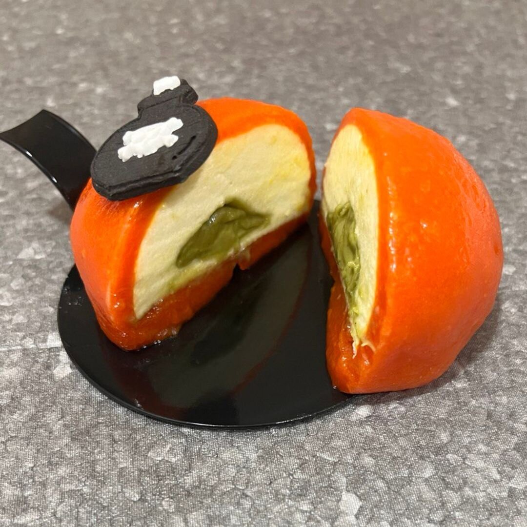 Llenar moldes media esfera, inyectar Spalmella Pistacchio en el centro del relleno y congelar.