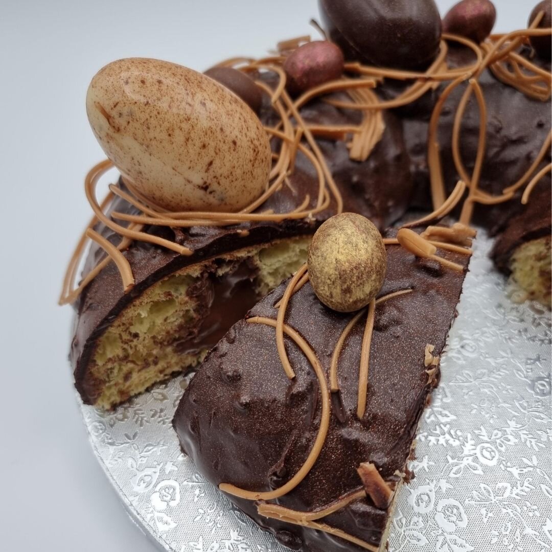 Bañar con el baño especial para monas y decorar con huevos, hilos de chocolate.