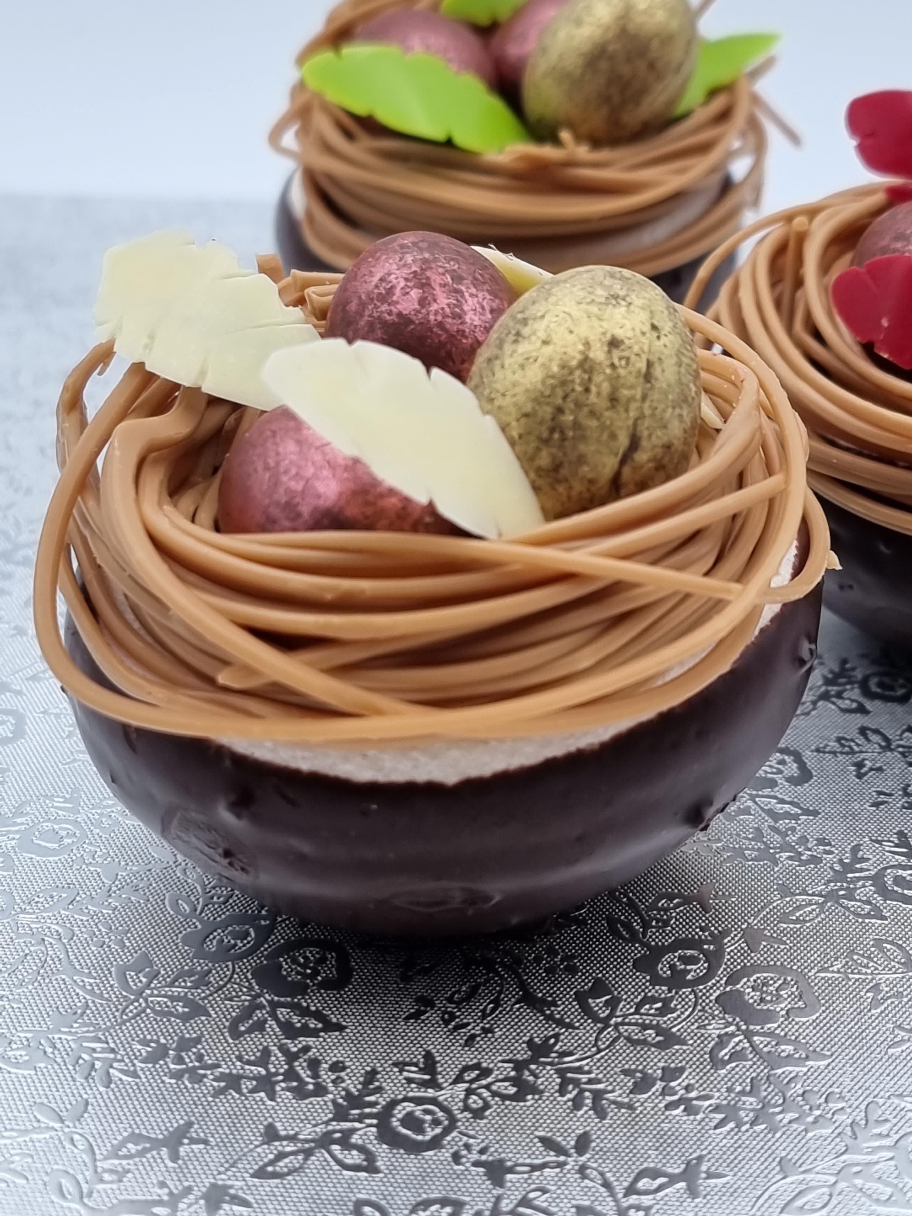 Con manga y boquilla lisa redonda 20 mm, formar los nidos sobre un molde se silicona por la parte exterior.