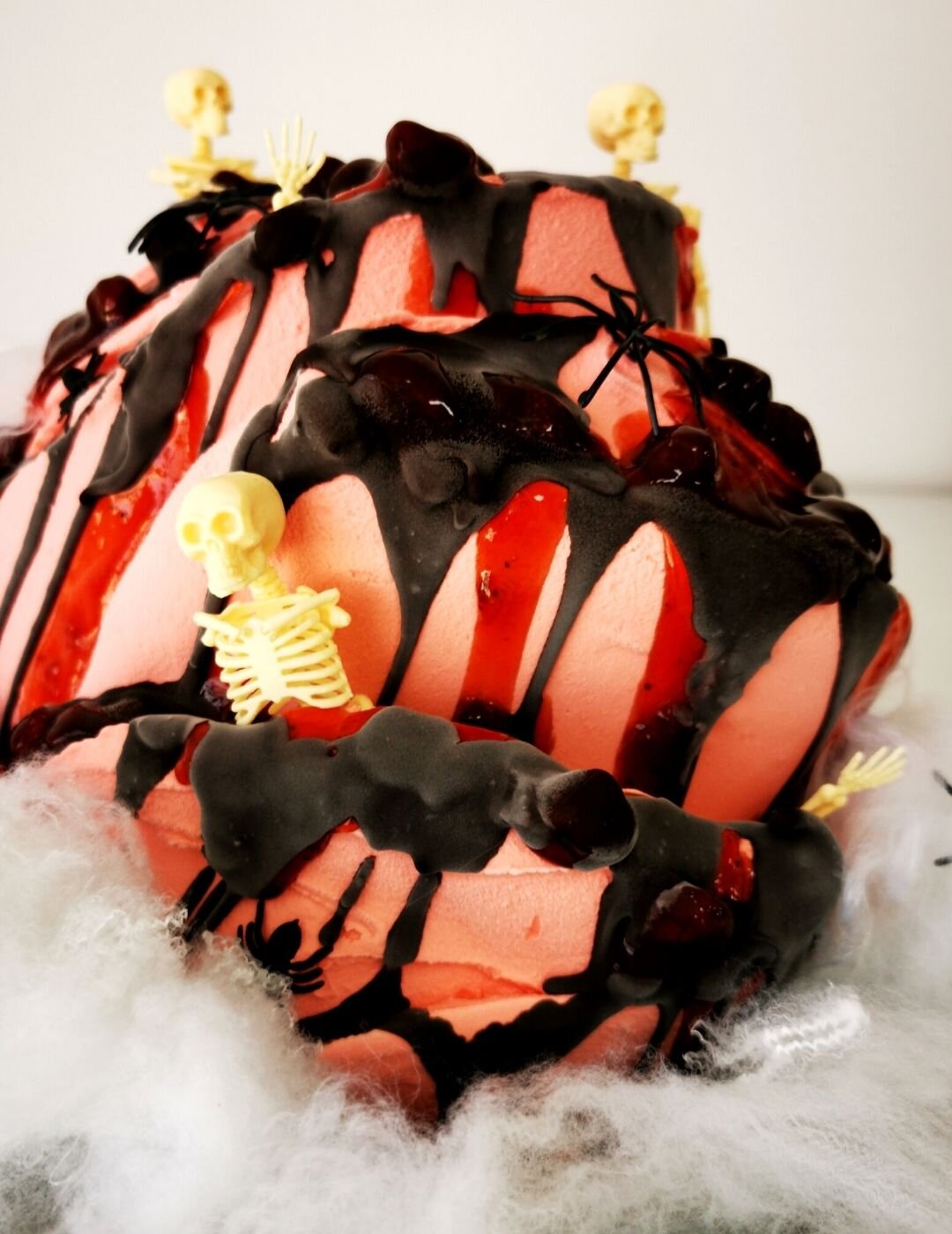 Cubrir con Variegó Fresa y Macao (Stracciatella). Opcional: Añadir horripilantes decoraciones de esqueletos, arañas, etc.