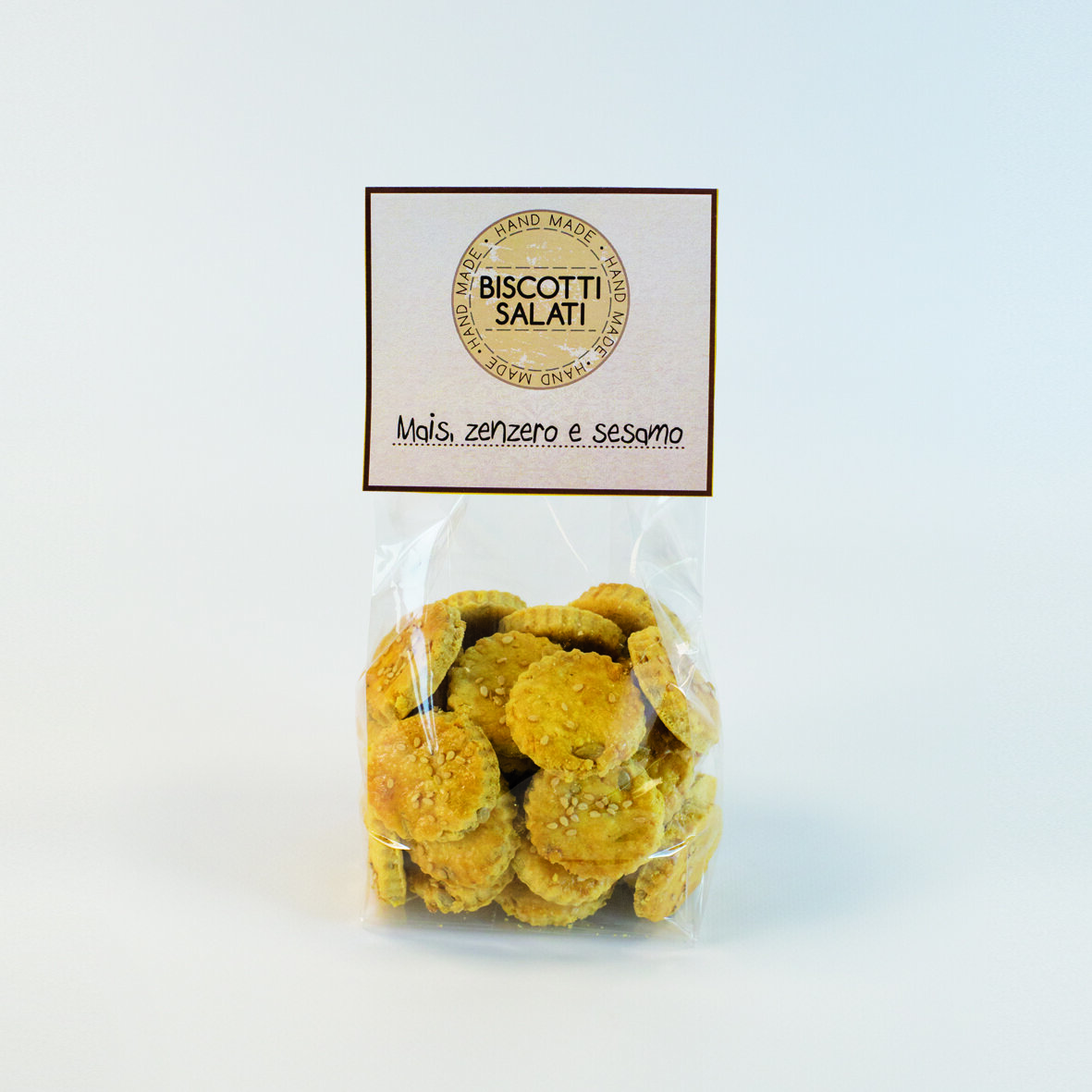 Extender con la laminadora hasta un grosor de 4,5 mm y cortar con cortador redondo. Pintar la galleta con agua y huevo y espolvorear sésamo. Hornear a 170 ° C durante 12 min.