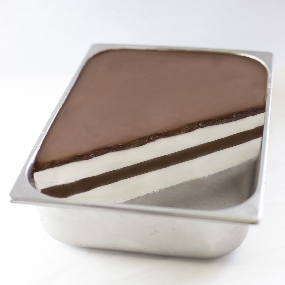 Mezclar Schokobella fundida con Gelatella Chocomilky y aplicar sobre la pieza congelada.