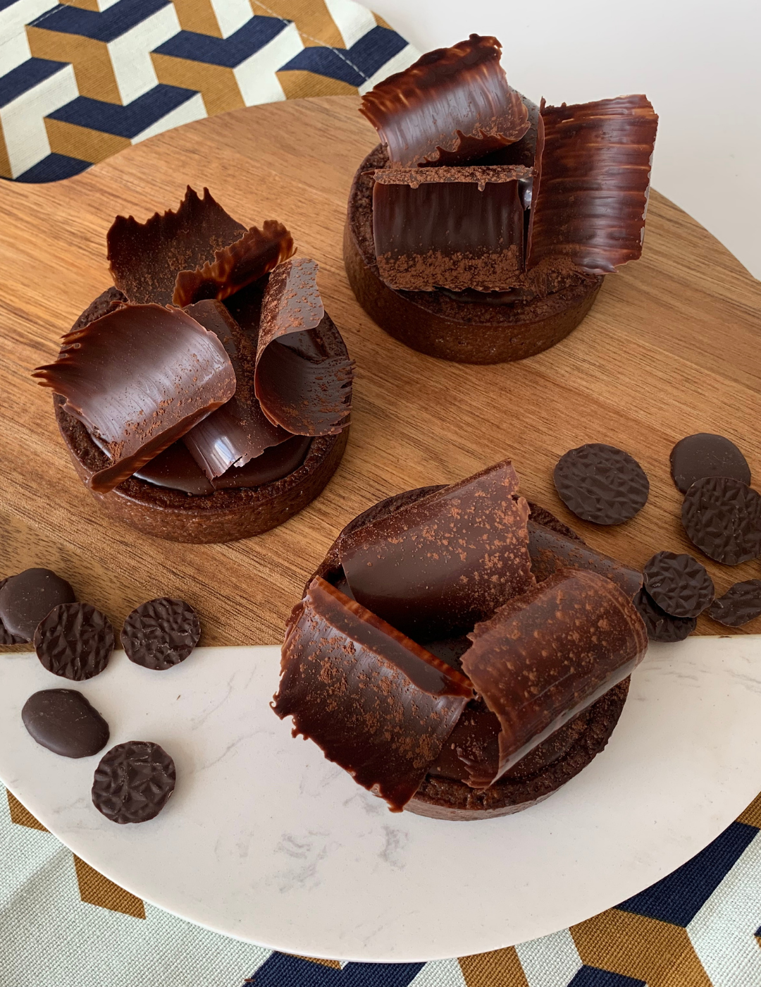 Finalizar con decoraciones hechas de cobertura de chocolate negro (Ratzeburg Chips Dark 70%).