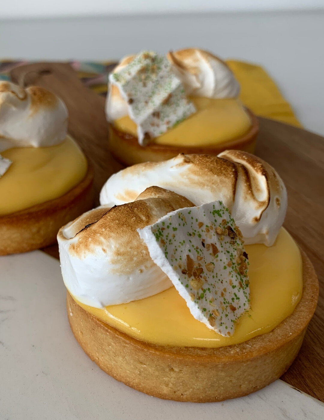 Llenar la base de la tartaleta con la crema yuzú, acomodar el disco de bizcocho y cubrir con más crema. Decorar con merengue.