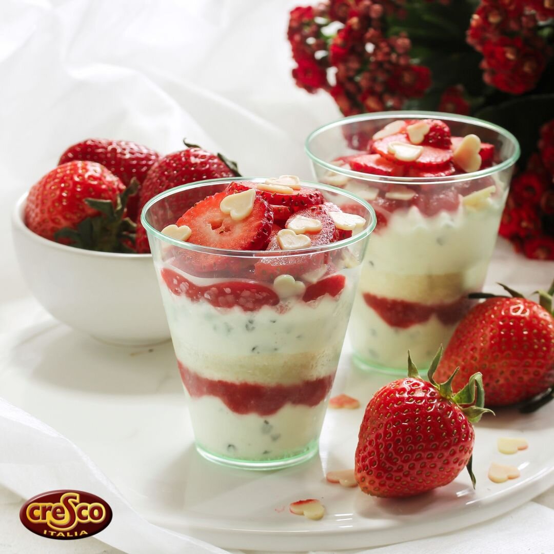 Elaboración: Colocar en el fondo de los vasos con Gelatella Frollina, llenar con la mousse elaborada. Decorar por la parte superior con Variegò Mango-Maracuyá, Fragola, Frutos del Bosque o Lampone